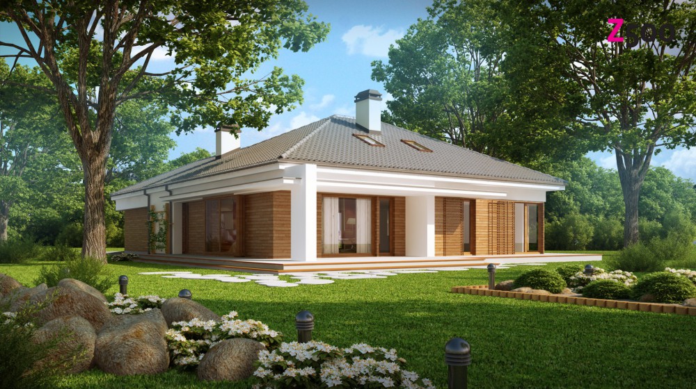 Z206 — это практичный одноэтажный дом с тремя спальнями, с гаражом для двух автомобилей. Возможность адаптации мансарды позволит при необходимости расширить жилую площадь.