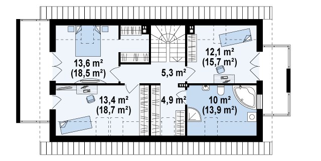 На первом уровне в правой части дома спроектирована дневная зона со светлой гостиной и открытой кухней, рядом с которой предусмотрена столовая. Через гостиную можно выйти на открытую террасу. Мансарда полностью отведена под ночную зону: здесь спроектированы три просторные спальни. Кроме того, есть одна общая гардеробная, просторная ванная комната и небольшое помещение в одной из спален. В каждой спальни по проекту предусмотрен выход на балкон.
