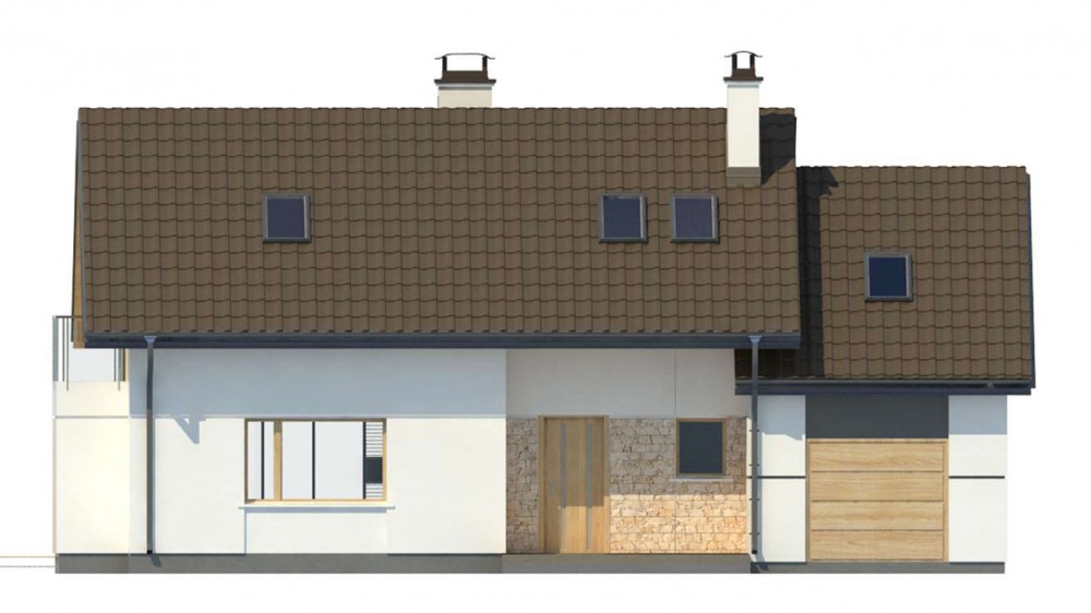 Дом с двускатной кровлей, с гаражом для одного автомобиля.