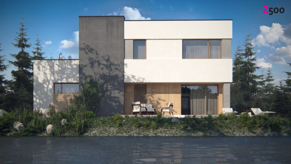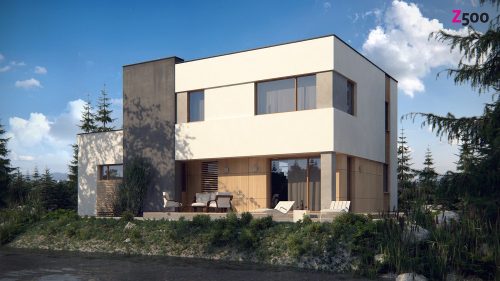 Проект Zx59 представляет двухэтажный дом модернистского дизайна с гаражом и великолепной террасой на верхнем этаже. Броско оформленный фасад притягивает внимание полностью остеклённым эркером, в котором расположен лестничный марш. Его стильная форма поддержана контрастным оформлением. Яркие архитектурные решения и продуманная планировка каждого уровня делают проект интересным и с практической, и с эстетической стороны.